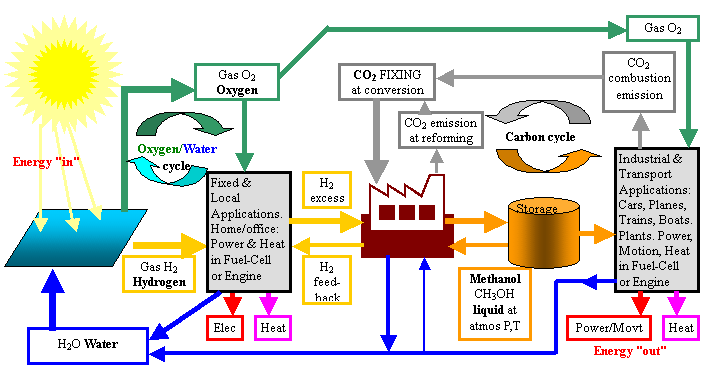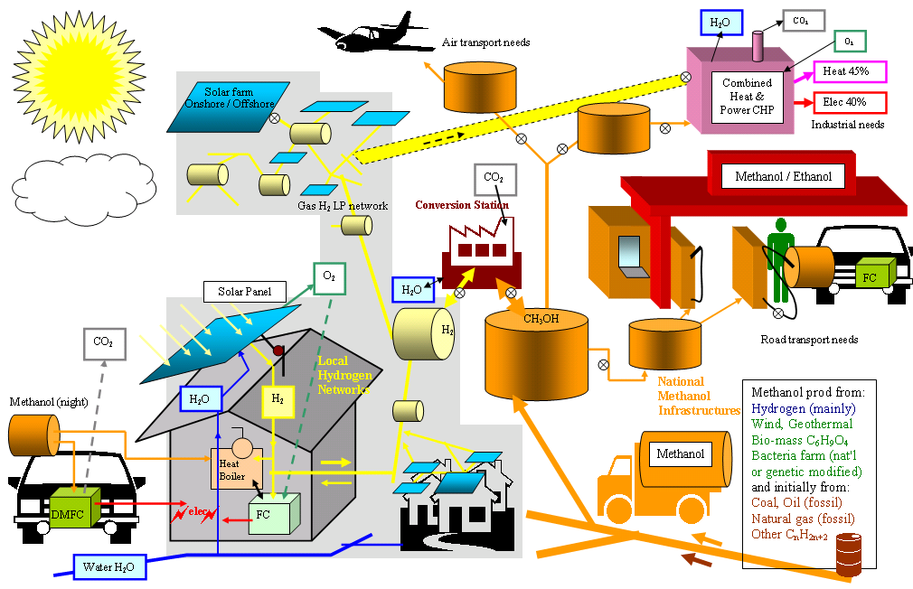 2/ Hydrogen (H2) transportation in the form of methanol (CH3OH, could be written COH4), conveniently a liquid-fuel at atmospheric pressure & temperature like gasoline!