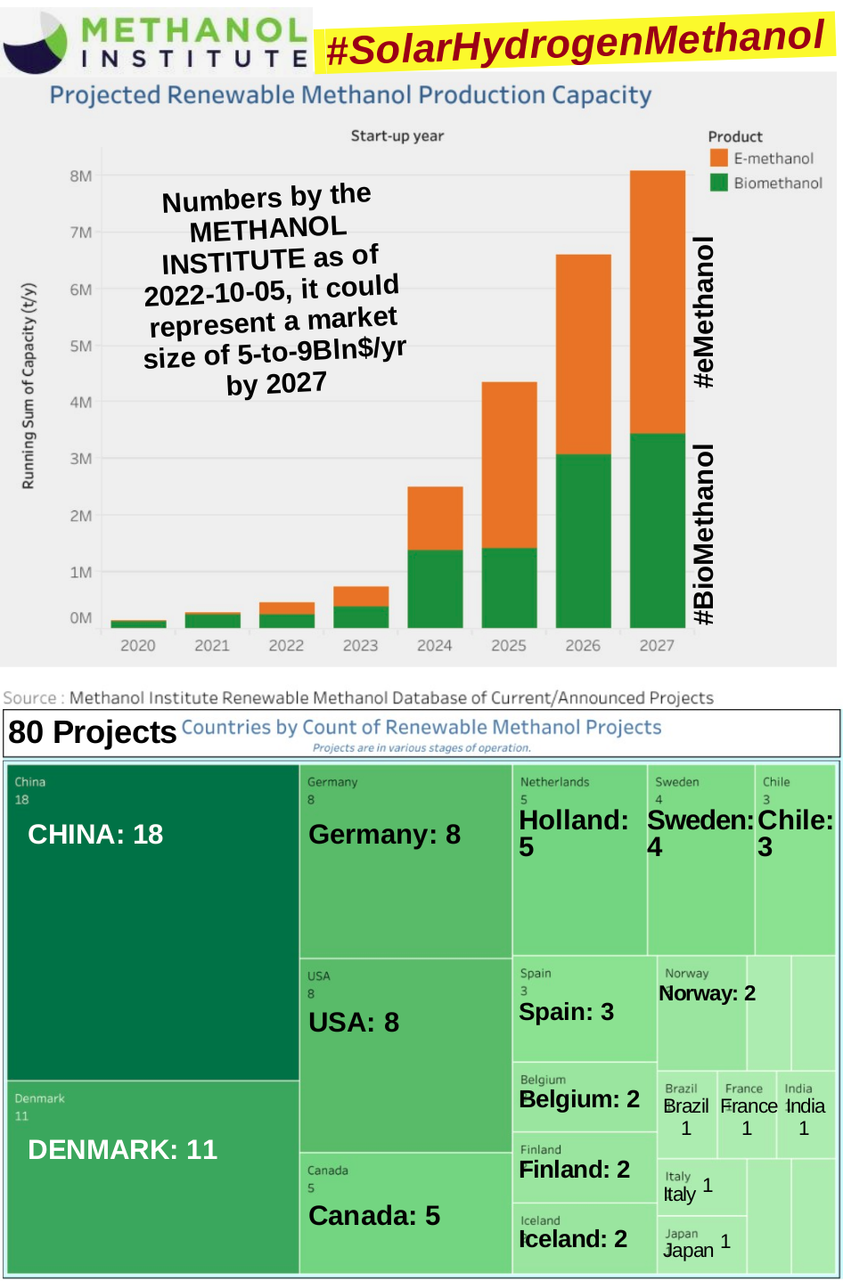 A1/ MARCHÉ (LA DEMANDE, en MILLIARDS de DOLLARS): il est lancé vigoureusement par #MAERSK #MaerskMethanol du Danemark, par le français CMA-CGM et par 2 autres sociétés chinoises de porte-containers: #COSCO 中国远洋运输有限公司 et China Merchants Energy Shipping Company Limited 招商局能源运输股份有限公司: leur avantage clé est que les moteurs sont dual-fuel (bi-combustibles) donc ils pourront brûler du gazole normal s’il n’y pas assez de méthanol renouvelable lors d’une escale! Les besoins de ces 4 compagnies représentent DÉJÀ 80 fois la production actuelle mondiale de méthanol (même non-neutre en CO2), donc tout producteur de méthanol un peu vert pourra leur vendre son méthanol.